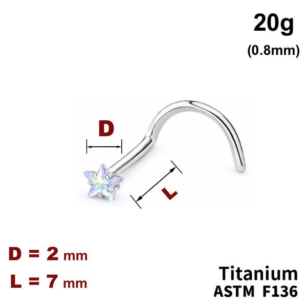 Сережка-нострил у ніс вигнута, 7мм, вкраплена зірочка AB 3мм, 20g (0.8мм), ТИТАН