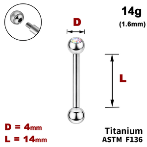 Штанга (барбел) 14мм з кульками 4мм, одна з яких з Кристалом AB, 14g (1.6мм), Зовні різьблення, ТИТАН