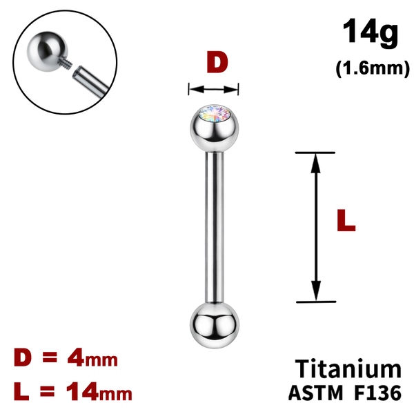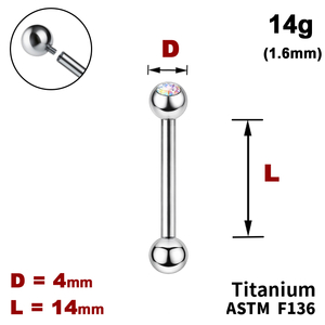 Штанга (барбелл) 14мм з кульками 4мм, одна з яких з Кристалом AB, 14g (1.6мм), Усередині різьблення, ТИТАН