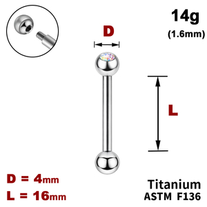 Штанга (барбел) 16мм з кульками 4мм, одна з яких з Кристалом AB, 14g (1.6мм), Зовні різьблення, ТИТАН