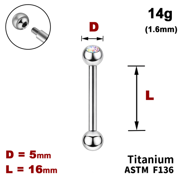 Штанга (барбел) 16мм з кульками 5мм, одна з яких з Кристалом AB, 14g (1.6мм), Зовні різьблення, ТИТАН