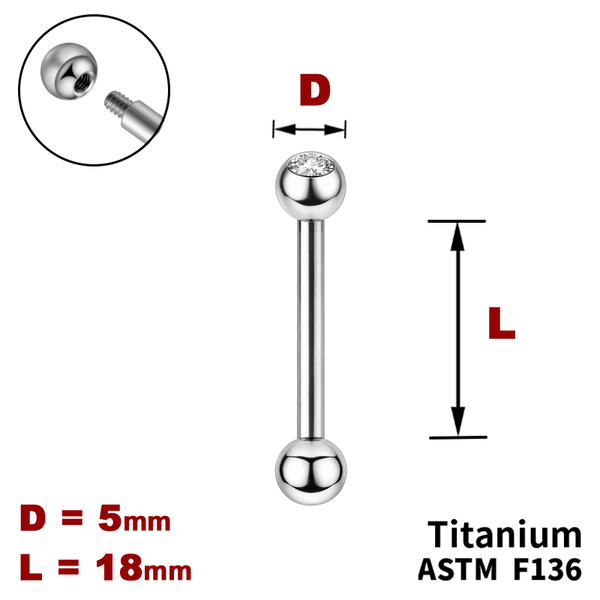 Штанга (барбел) 18мм з кульками 5мм, одна з яких з Прозорим Кристалом, Зовні різьблення, ТИТАН (G = 14g (1.6мм))