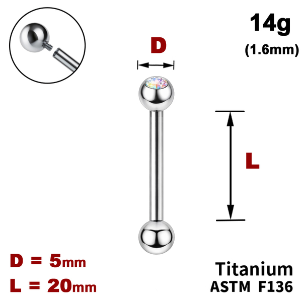 Штанга (барбелл) 20мм з кульками 5мм, одна з яких з Кристалом AB, 14g (1.6мм), Усередині різьблення, ТИТАН