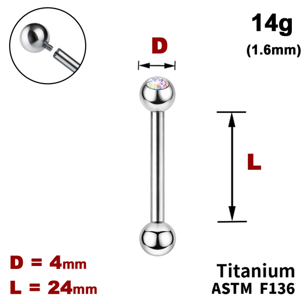 Штанга (барбелл) 24мм з кульками 4мм, одна з яких з Кристалом AB, 14g (1.6мм), Усередині різьблення, ТИТАН