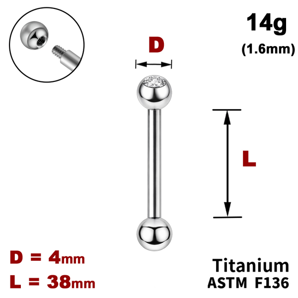 Штанга (барбелл) 38мм с шариками 4мм, один из которых с Прозрачным Кристаллом, 14g (1.6мм), Снаружи резьба, ТИТАН