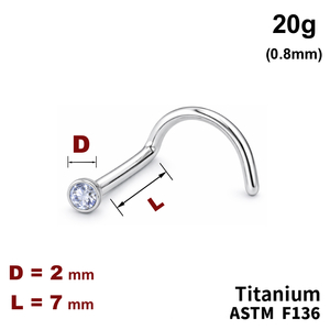 Сережка-нострил у ніс вигнута, 7мм, завальцьований кристал 2мм, 20g (0.8мм), ТИТАН