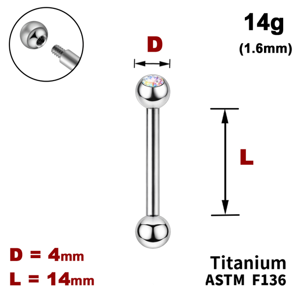 Штанга (барбел) 14мм з кульками 4мм, одна з яких з Кристалом AB, 14g (1.6мм), Зовні різьблення, ТИТАН