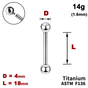 Штанга (барбелл) 18мм з кульками 4мм, одна з яких з Кристалом AB, 14g (1.6мм), Усередині різьблення, ТИТАН