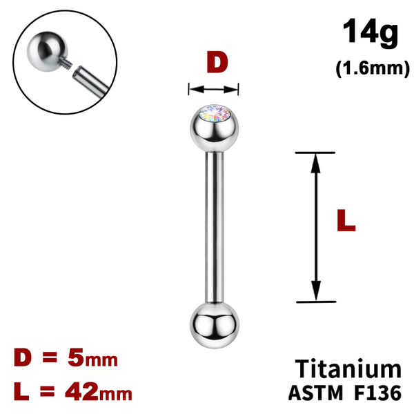 Штанга (барбелл) 42мм з кульками 5мм, одна з яких з Кристалом AB, 14g (1.6мм), Усередині різьблення, ТИТАН