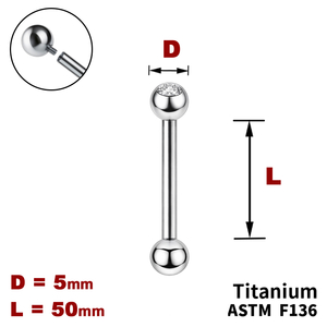 Штанга (барбел) 50мм з кульками 5мм, одна з яких з Прозорим Кристалом, Усередині різьблення, ТИТАН (G = 14g)