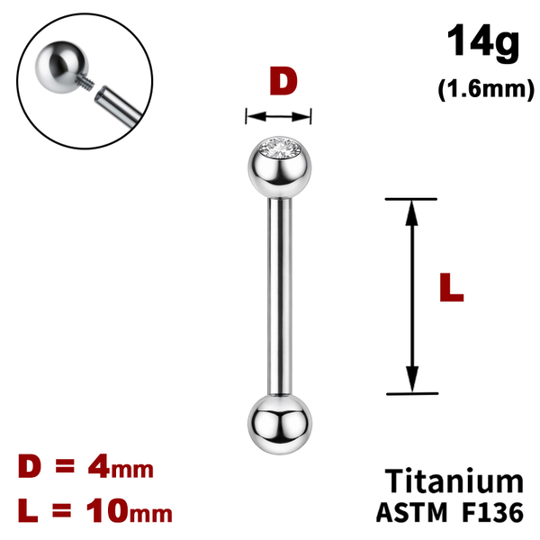 - Штанга (барбелл) 10мм с шариками 4мм, один из которых с Прозрачным Кристаллом, 14g (1.6мм), Внутри резьба, ТИТАН