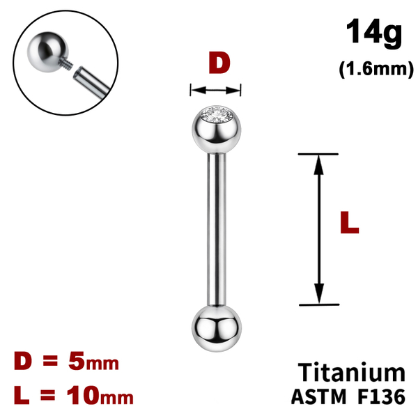 - Штанга (барбелл) 10мм с шариками 5мм, один из которых с Прозрачным Кристаллом, 14g (1.6мм), Внутри резьба, ТИТАН