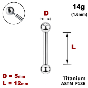 - Штанга (барбелл) 12мм с шариками 5мм, один из которых с Прозрачным Кристаллом, 14g (1.6мм), Внутри резьба, ТИТАН